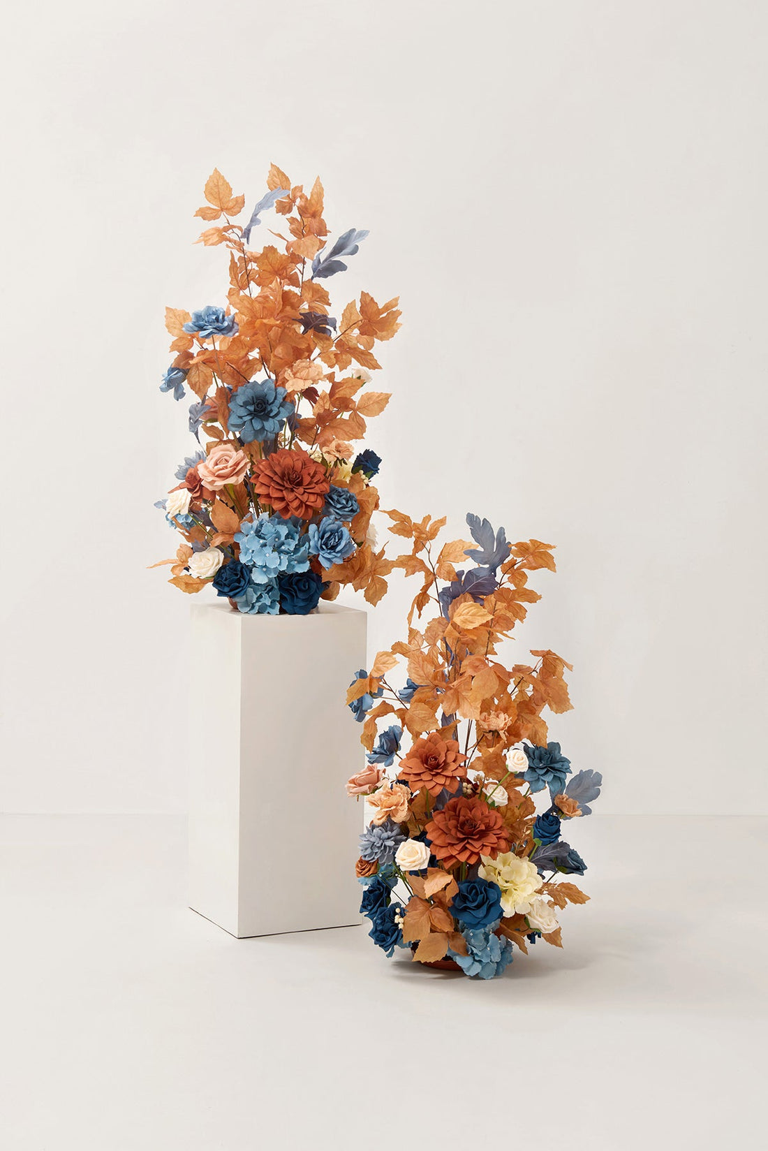 Oversized Free-Standing Ground Flower Arrangements in Russet Orange & Denim Blue
