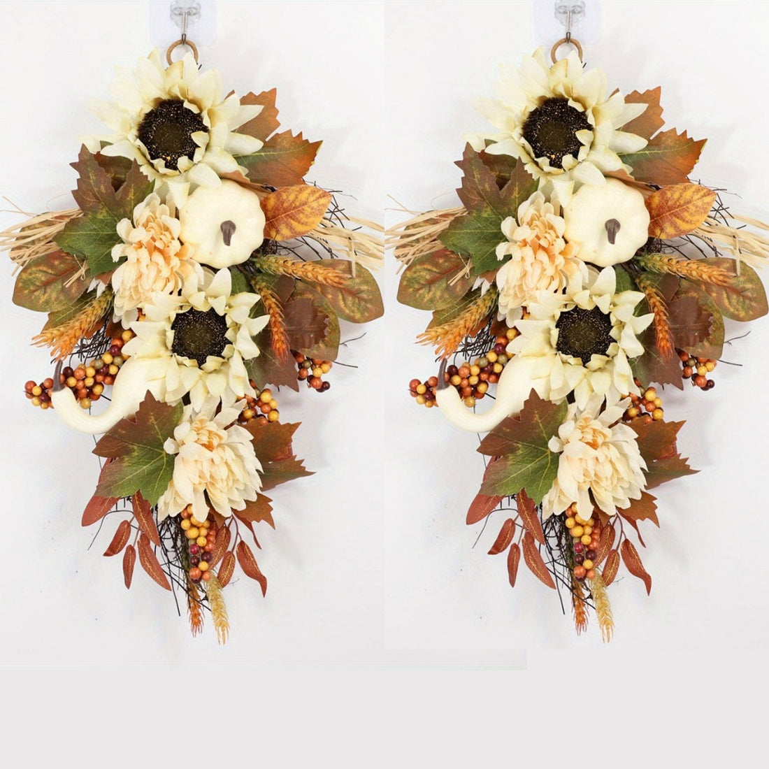 2 Pcs Fall Wreath Artificial White Pumpkin Wreath, 17.71in White Sunflower Autumn Harvest Wreath with Leaves Flower Fall Door Garland Thanksgiving Theme Swag Teardrop Swag Halloween Wreath for Front Door
