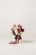 - Material: Made of an organic mix of floral blooms in burgundy, blush, and white rose to make for a moody masterpiece, sprinkled with pink lady orchid and greenery.