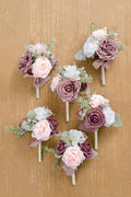 - Materials: This dusty rose set is made with dusty rose avalanche roses, mauve roses, dusty rose rosebuds, blush roses, blush camellias, and white gardenias, filled with some ferns, dusty miller greeneries, and gold floral picks.
