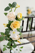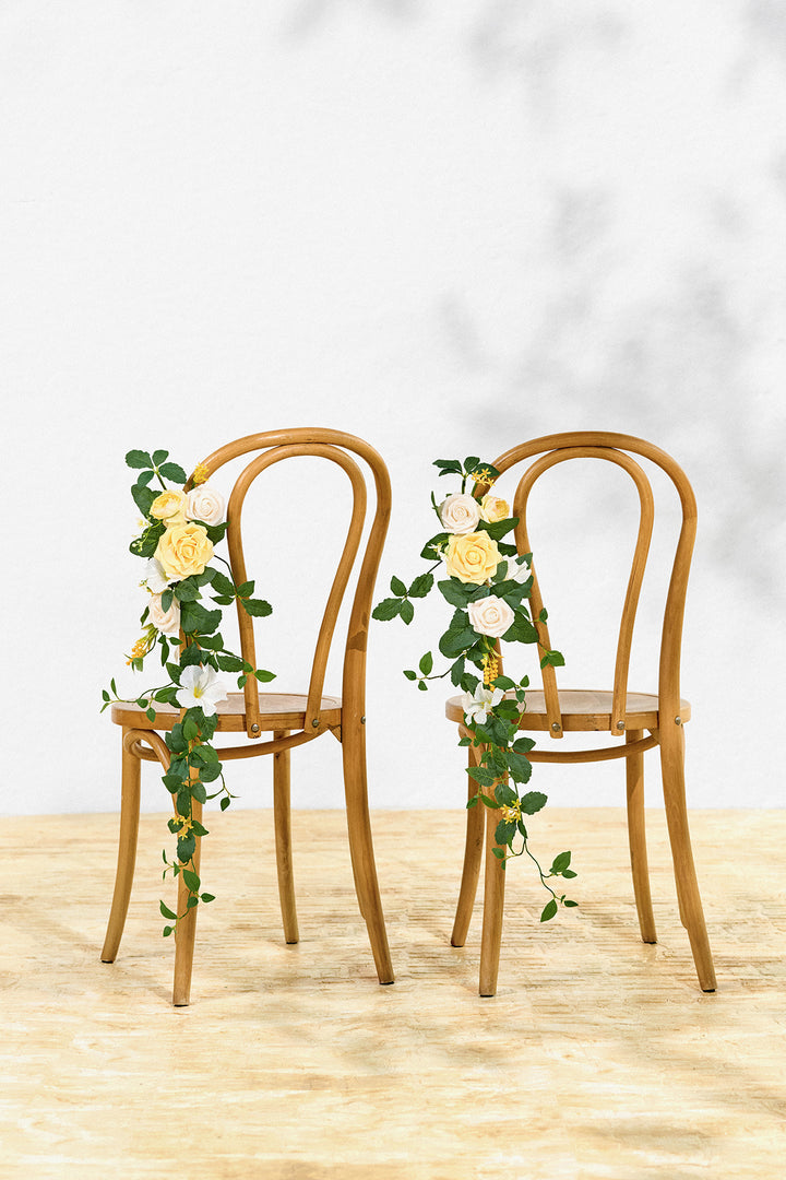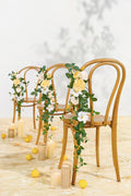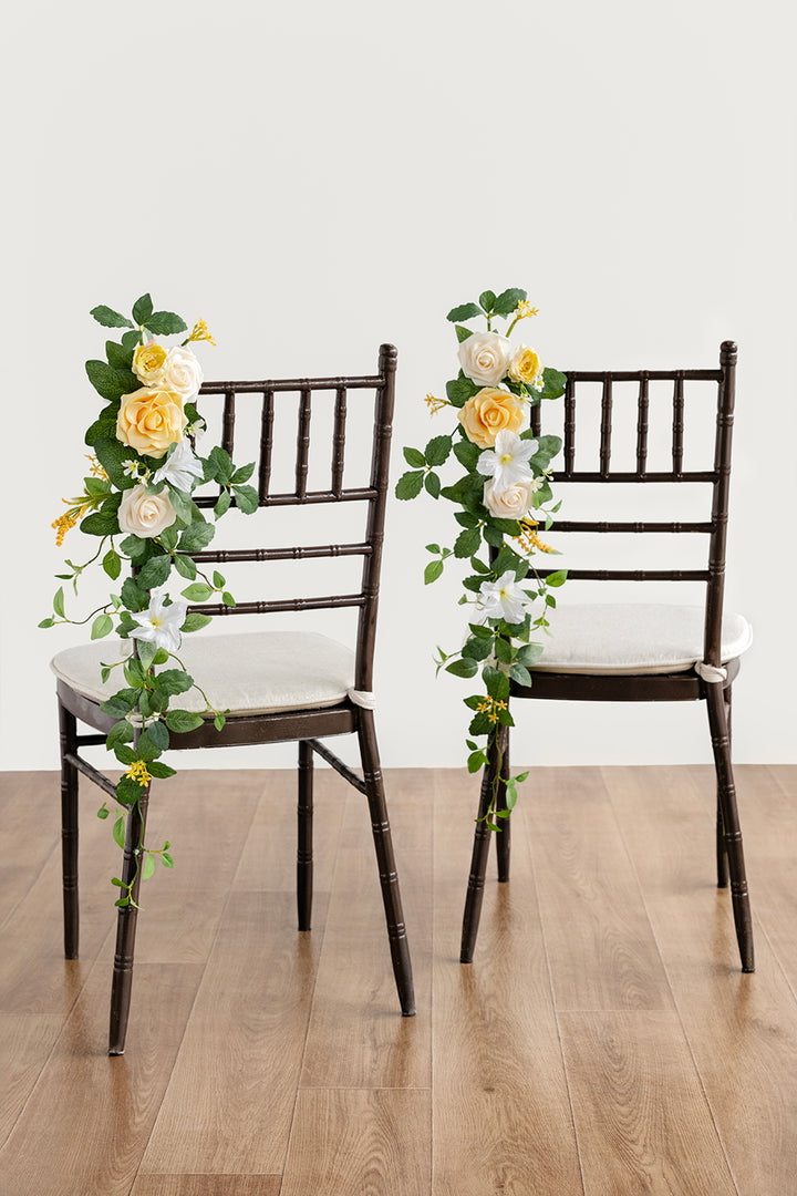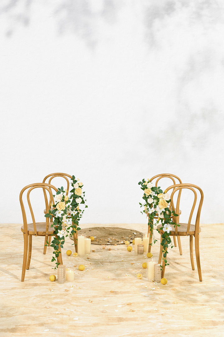Decorate your wedding with a touch of Mediterranean elegance with these Lemonade Yellow floral arrangements on aisle chairs. Elevate the overall aesthetic of your special day with these stunningly vibrant decorations.